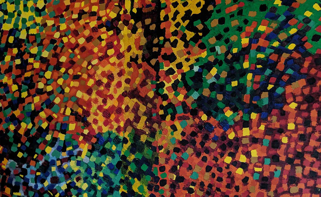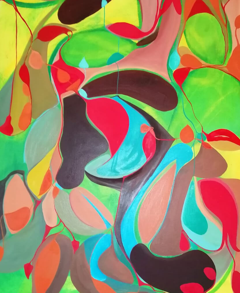 A strong sense of colour characterizes my work. For me, the application of paint and the surface it's applied to hold equal importance to the narrative conveyed on the canvas itself.